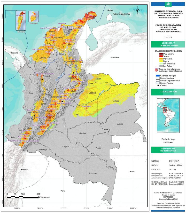 El Mapa de Zonificación de la Degradación de Suelos por Desertificación está disponible a una escala de 1:100.000 para el área continental de Colombia y 1:10.000 para el Archipiélago de San Andrés y Santa Catalina. Entre los datos más destacados del mapa se encuentran: